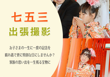 七五三の参拝にプロカメラマンが同行し、神社のベストスポットだけでなく、準備からご祈祷の様子も撮影します。お子様の着物レンタルもセットになったプランです。